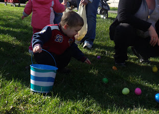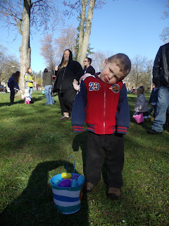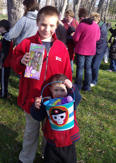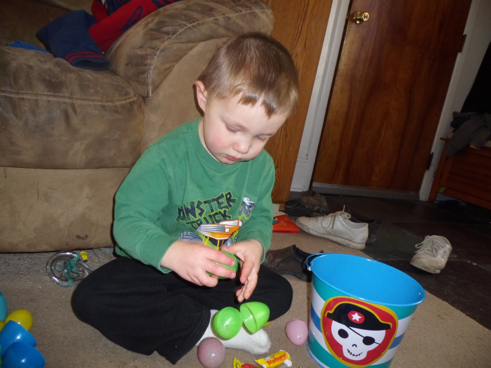 Andrew found a special egg that he got a chocolate bunny for. He got half the eggs Jonathan did but got a good one! Jonathan had to show off his egg collection. Every egg is special I told him since Andrew got a special egg and he didn't