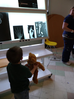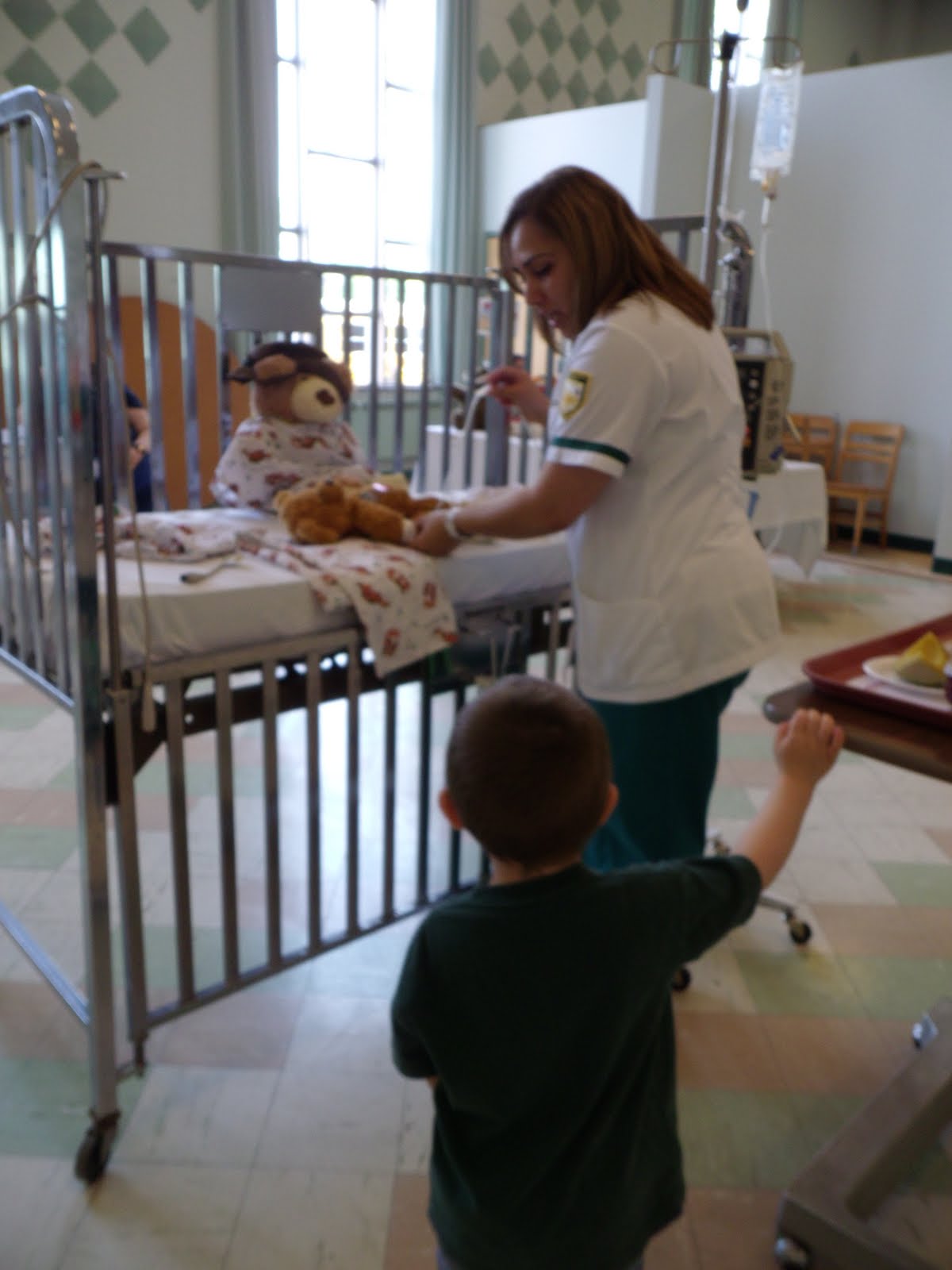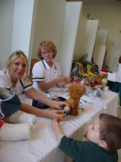 They treat the Teddy Bears like patients so the kids wouldn't be so scared of hospitals and so forth. Andrew loved this at his age. But then again he was very use to be around the hospital setting that was like a second home to him. Jonathan on the other hand......