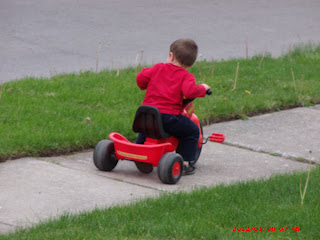 Jonathan's getting really good and really fast riding his trike.