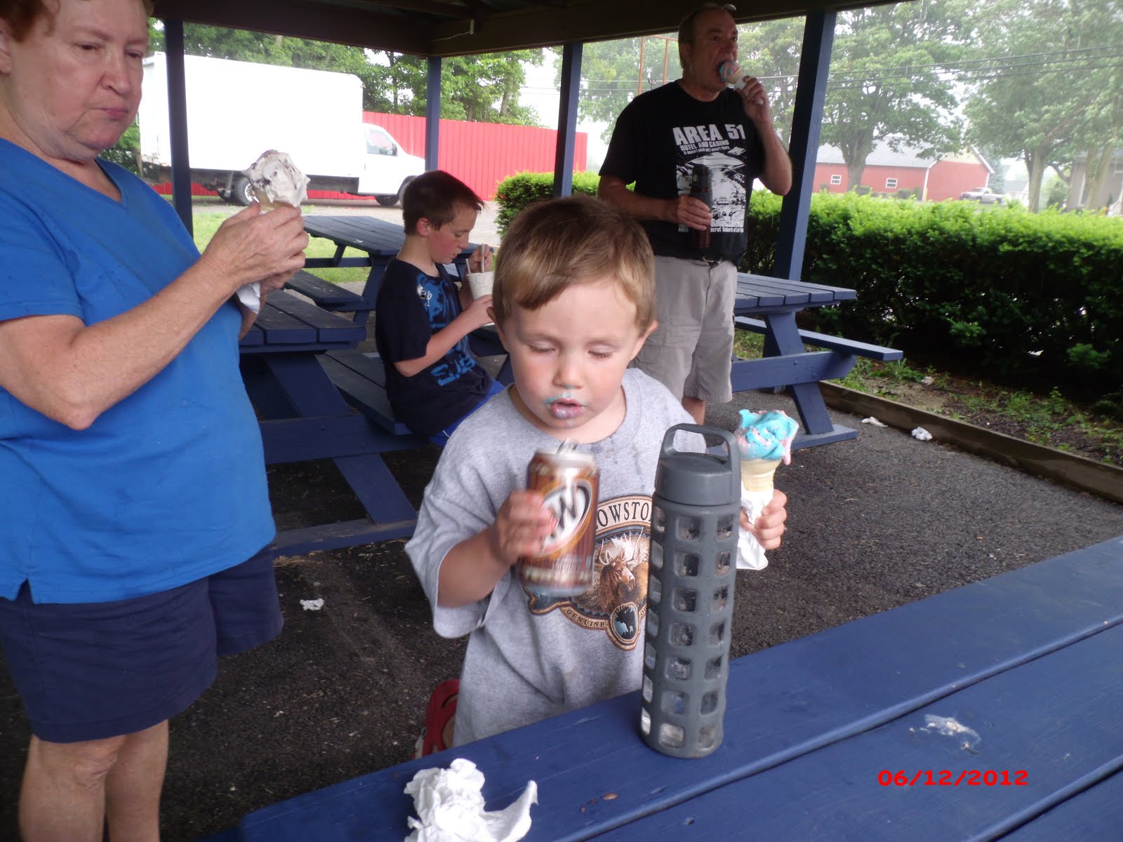 It was VERY hot Monday and Tuesday was VERY humid. So we all went for some ice cream that evening. As we ate the skies opened up and it POURED. The humidity left and it was rather cool, but we really enjoyed our ice cream! Grandma and Grandpa came with us