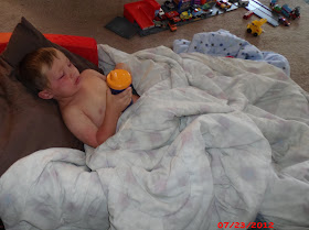 So we took him to urgent care and he was running all overSunday. He was very heat sensitive. He has FIFTH Disease...... its a virus like chicken pox with a very lovely rash to go with it. He's got an eye infection from rubbing his eyes. He just wasn't himself yesterday. Laid low all day. He's suppose to be on the upswing of this..... what's going on?
