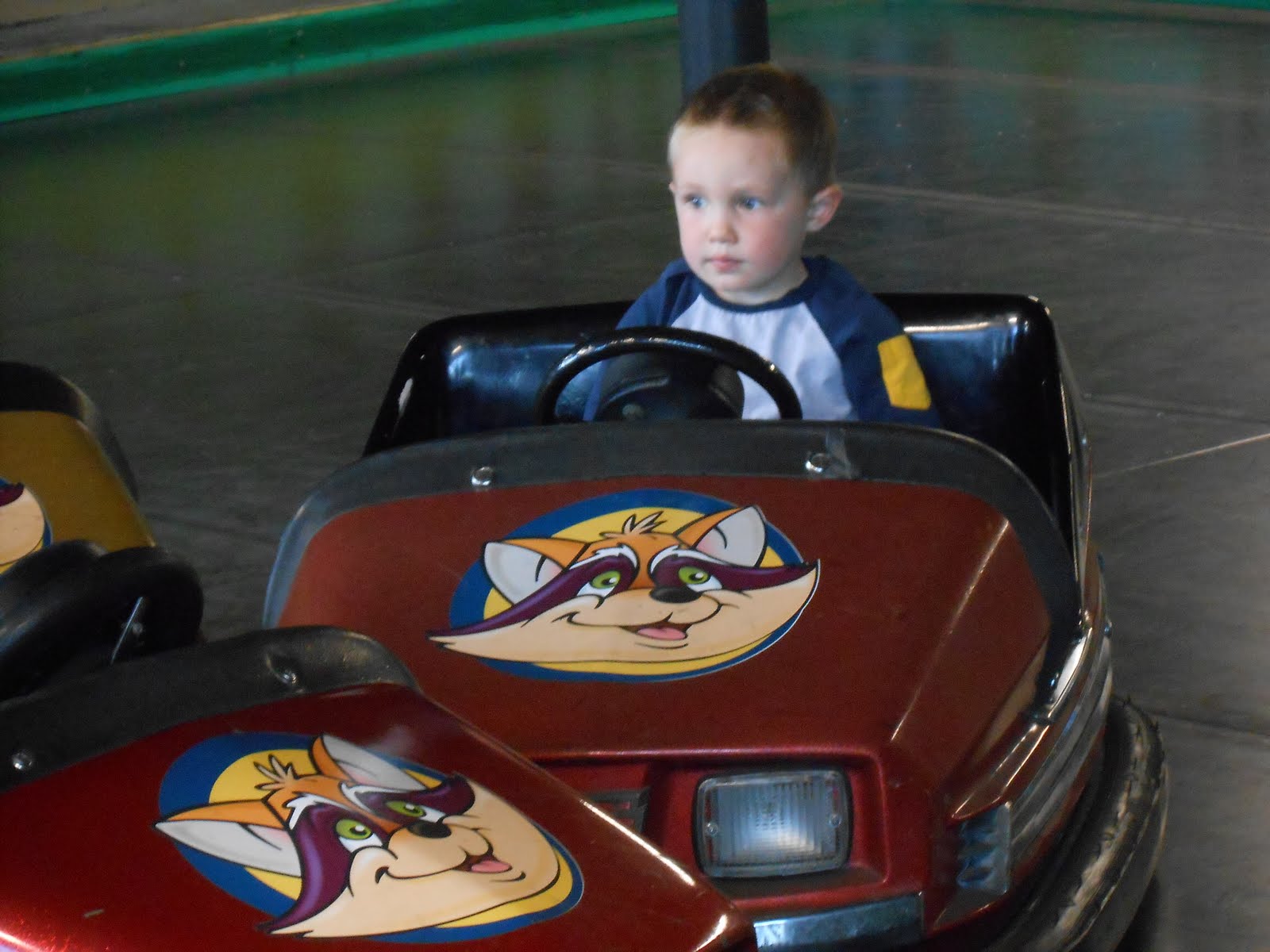 On the little roller coaster. Jonathan always picks his favorites.....bumper car its the red #3 and Rollercoaster was always #3