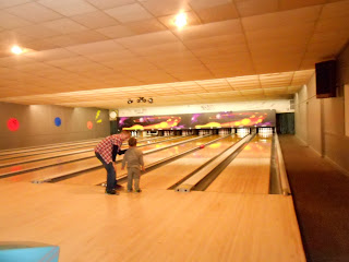 Went to Tanner's Birthday party at the bowling alley. Tanner showing Jonathan how to bowl.