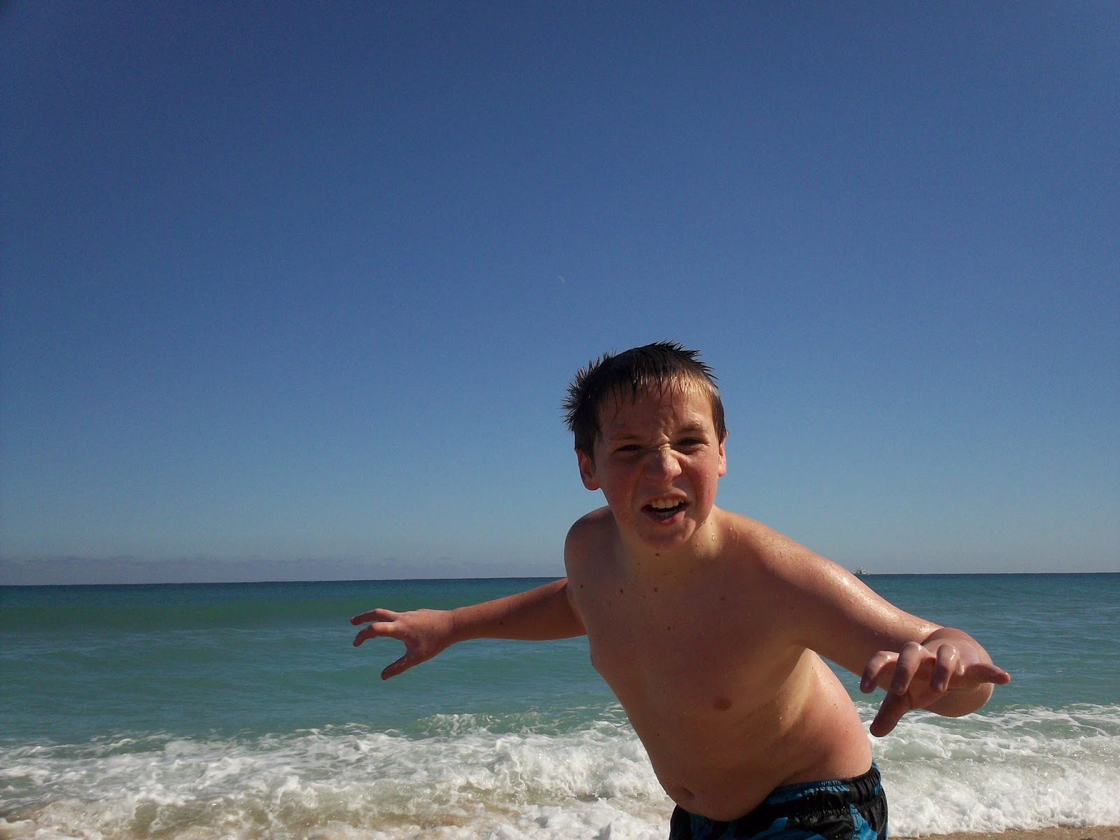 Both of them LOVED jumping the waves . Jonathan loves being by the shore and letting the waves hit him and toss him around. He didn't want to come out even though his teeth chattered and he was shaking