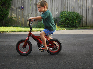 Finally got around to fixing the chain and he breaks one of the training wheels off. Guess what buddy you are out of luck with the training wheels. No problem after a few pushes...he's gone!!