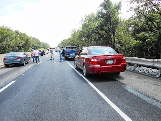 So we got caught behind an Accident on the PA turnpike and had to wait. The ambulance went down the middle so we could walk in the middle of the turnpike with out fear of getting hit. Everybody got out of their cars and walked around. It was very strange