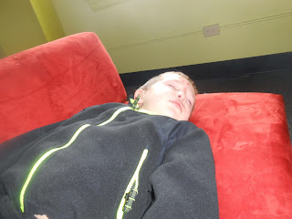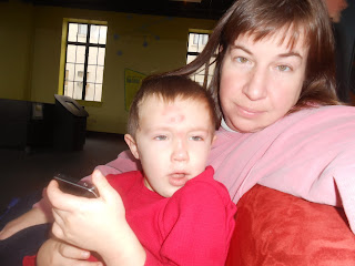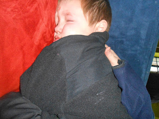 Jonathan was miserable and tired..... He was not happy to walk in the cold , so he danced around me and tripped smacking his face on the sidewalk. Face is all marked up . He cried and carried on quite a bit. It wore him out. He was not sleeping in these pictures. Just relaxing a bit.