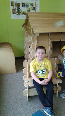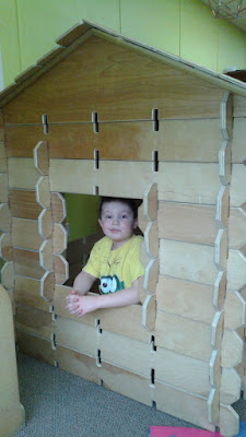 So Saturday Jonathan and I went to Explore and More. Andrew went with Community Services to Chuck E Cheese and had fun over there. Andrew is now to the point were this place is boring to him and really doesn't like being here. Jon on the other hand loves to build and that he does. He made this mostly by himself as I helped tell him were to put certain pieces to make it structurally good and have windows. I tried to do as little as possible at this point.