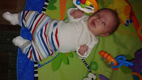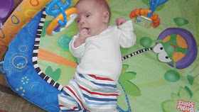 Wanting to play. He batted at his toys and laughed and cooed as he did.
