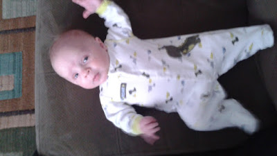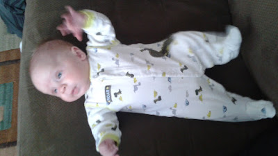 We had a bath and some pain reliever medicine and are getting ready for bed. Doing a little happy dance as our booties are off. I still want to use these cute pj's so I take his feet out add socks and put on the booties rolling the legs up./