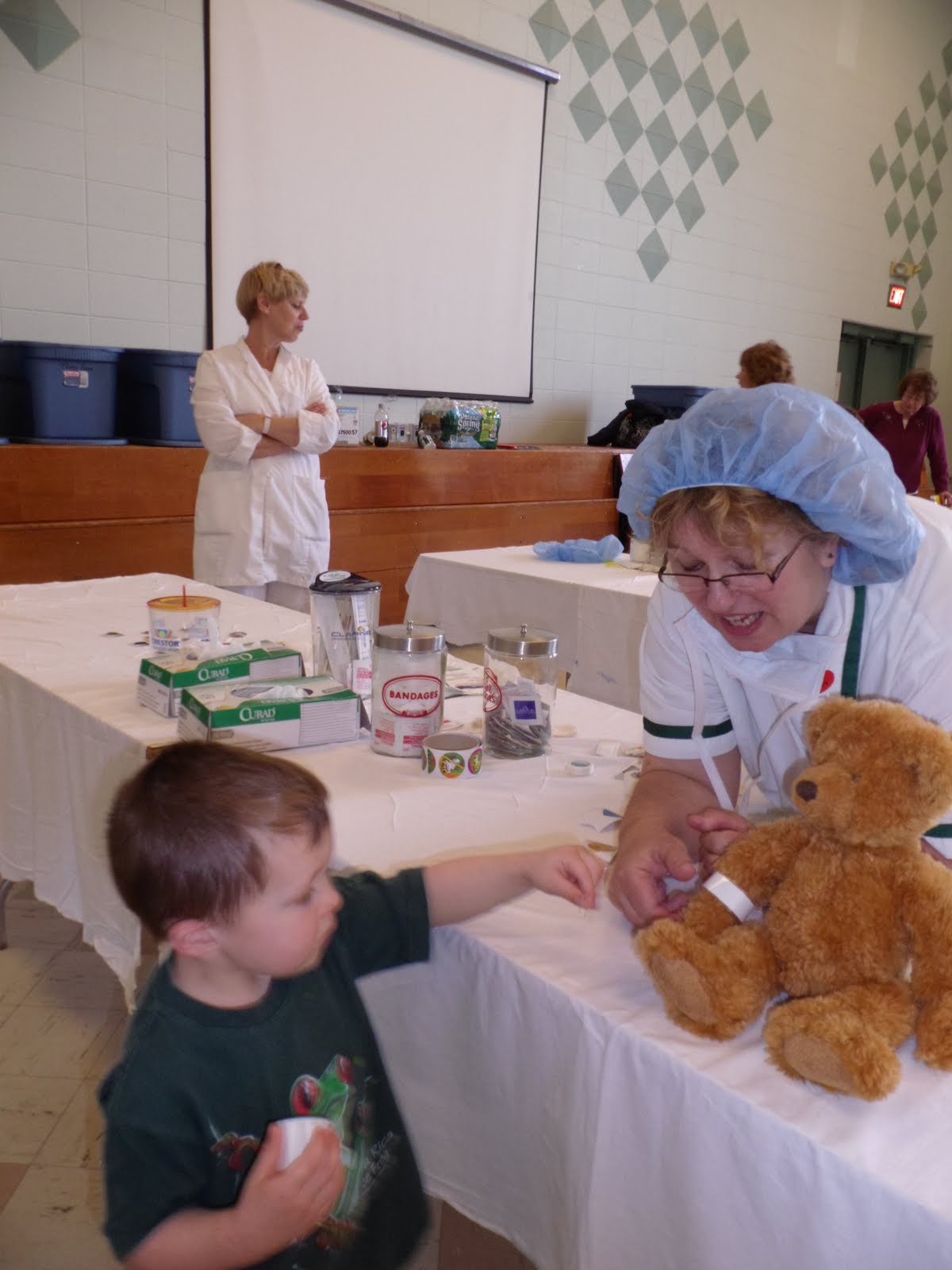 They treat the Teddy Bears like patients so the kids wouldn't be so scared of hospitals and so forth. Andrew loved this at his age. But then again he was very use to be around the hospital setting that was like a second home to him. Jonathan on the other hand......