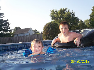 My little swimmers. He didn't want to wear his floaty but it was either wear it or sink so he wore it. Actually he can tread water pretty good its the keeping his head above water that's hard.