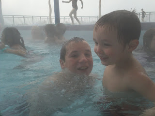 They have a heated pool outside .... first time Jonathan and I went in. Jonathan was NOT happy to go outside in the cold so I dragged him out there and threw him in. The pool was his size and nice and warm. Steam coming up from the pool. It was so cool to watch it snow on us.