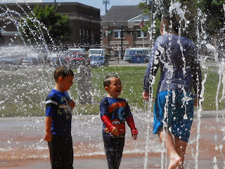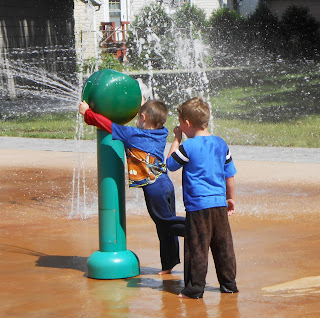 Getting wet at the Spray park. This year Jonathan has enjoyed going and playing in it. He's not crazy about cold water