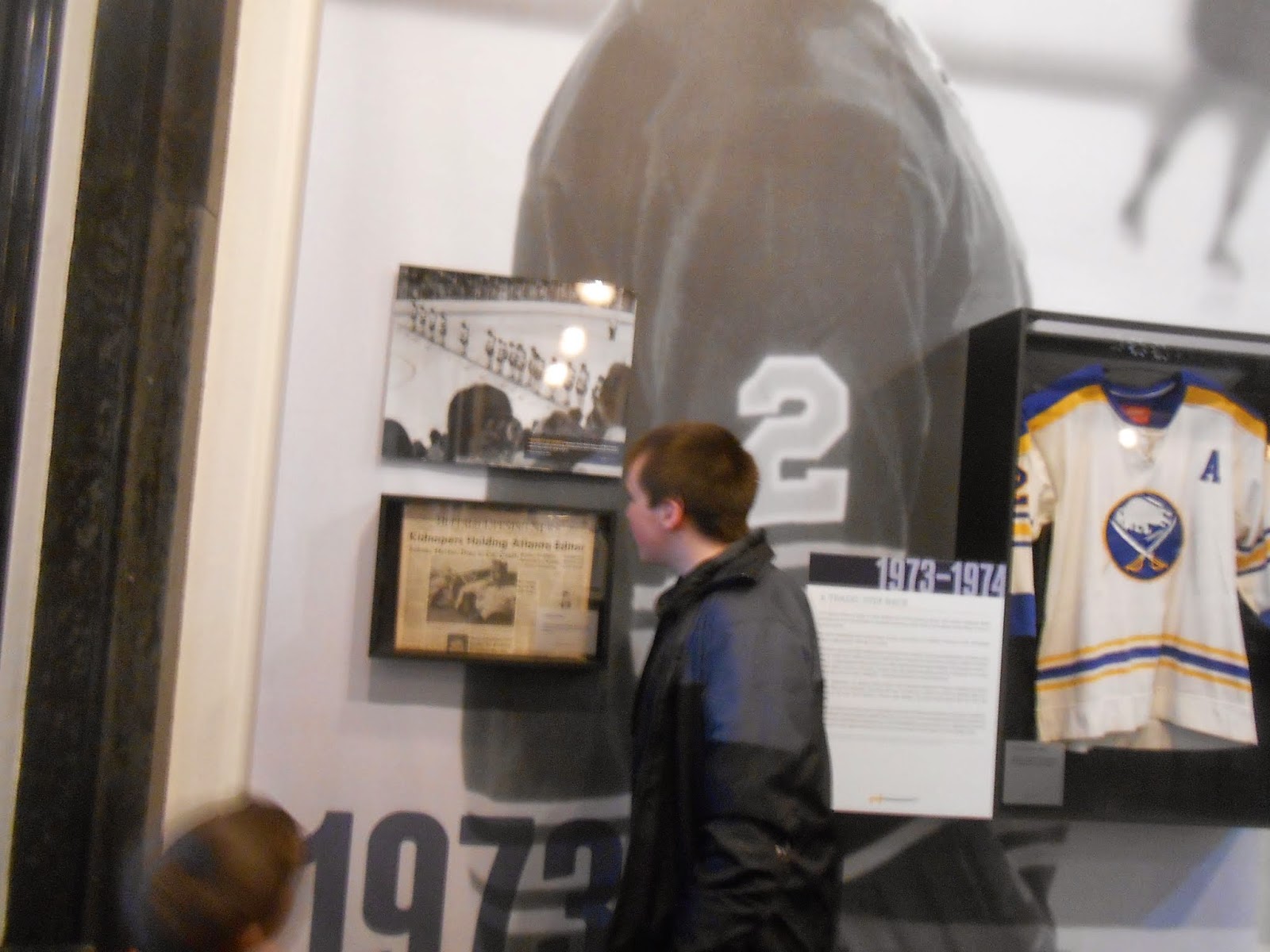 Buffalo Sabres exhibit. Andrew looking at the newpaper about Tim Horton....