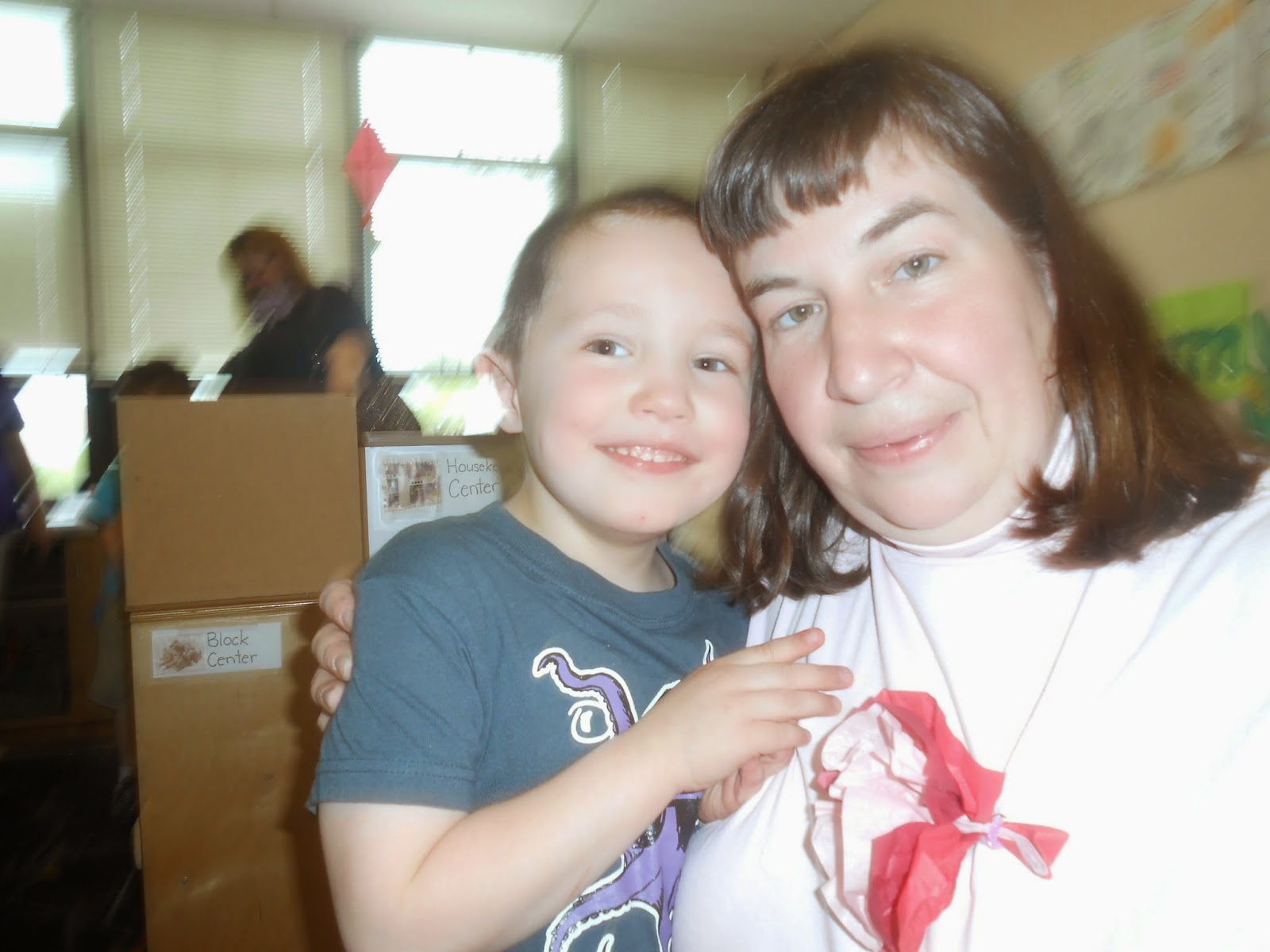 Jonathan is standing by his picture that he drew of me (flowers) The top of the board says