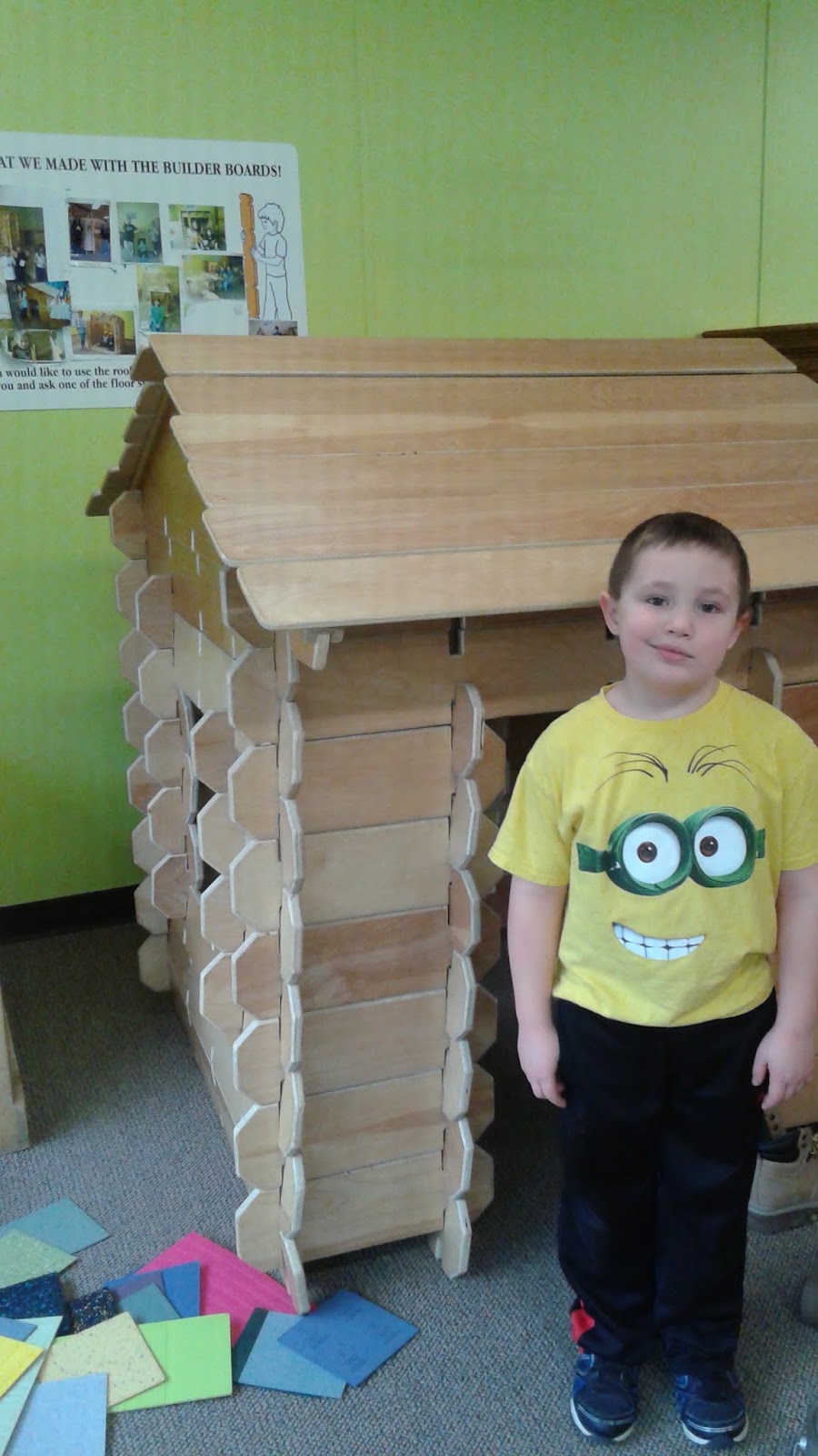 So Saturday Jonathan and I went to Explore and More. Andrew went with Community Services to Chuck E Cheese and had fun over there. Andrew is now to the point were this place is boring to him and really doesn't like being here. Jon on the other hand loves to build and that he does. He made this mostly by himself as I helped tell him were to put certain pieces to make it structurally good and have windows. I tried to do as little as possible at this point.