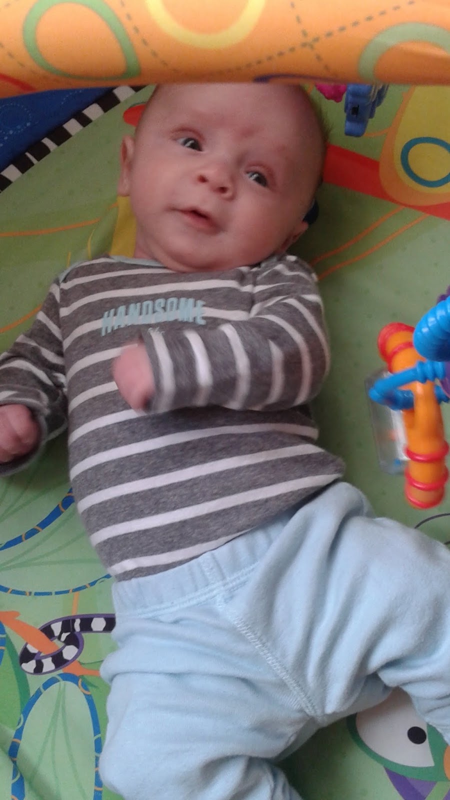 This little bugger just wants to be on the move. He has figured out with the brace on he can slide were he wants to on his mat and can't do it without the brace. He pushes his feet against the floor and it inches his tush up. Therefore he can choose what hanging thing he wants
