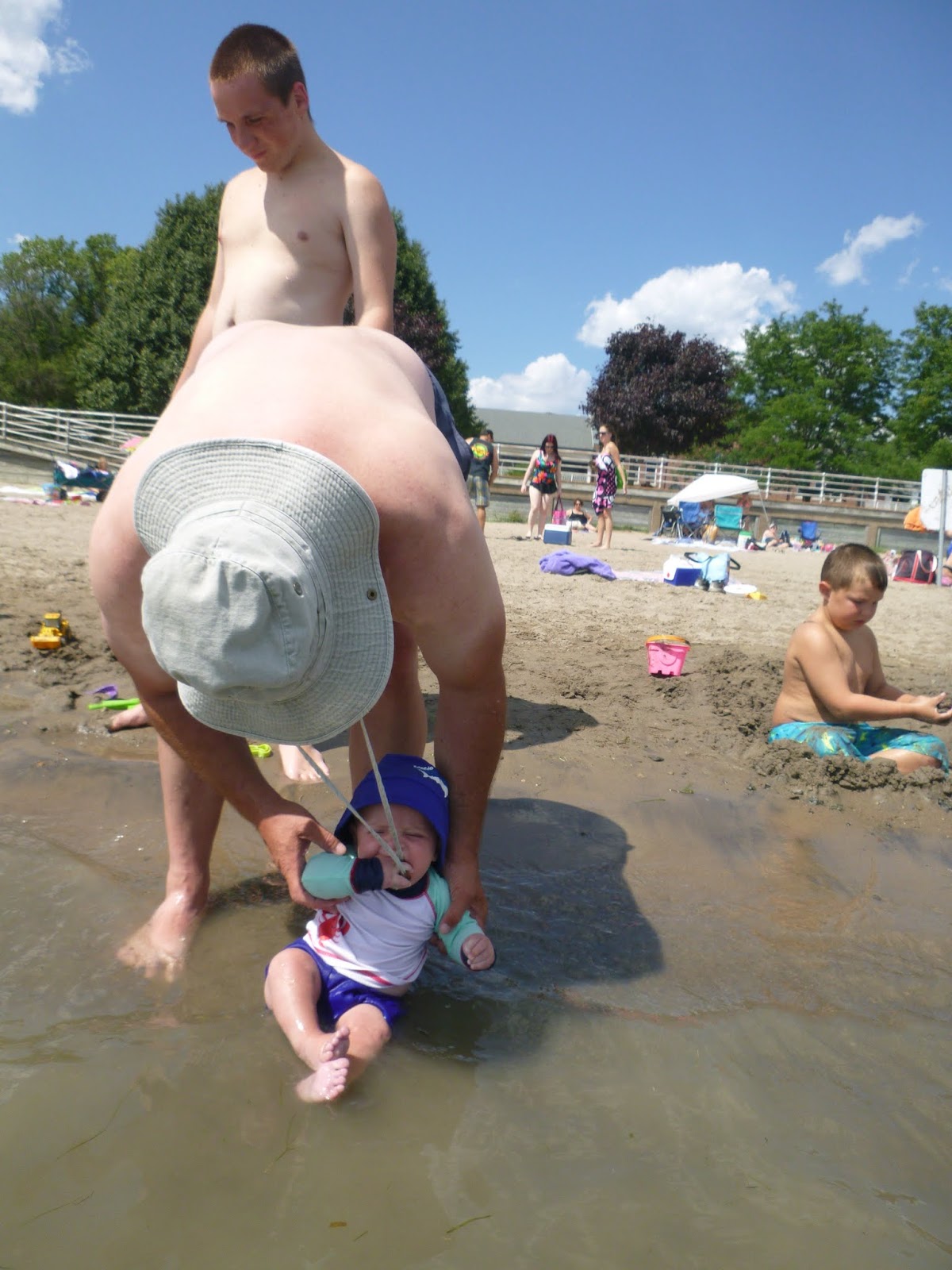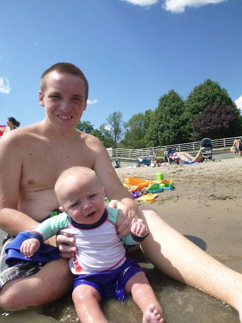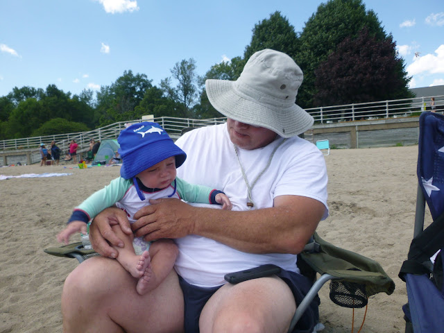 Alright...who put this sand in my water. I don't like it. He dug in the sand and outside of being hungry which he automatically puts his hands in him mouth, he really didn't try to eat it. He grumbled most of the time on the beach and in the water. I put him under a tree and he laughed and cooed. The water was warm. I just don't think he liked the sand on him