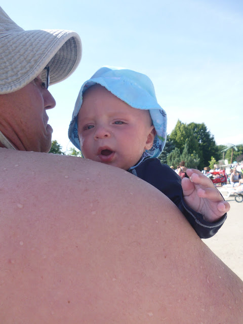 So mommy forgot my bathing suit at grandma and grandpa's and a baby wants to swim...what to do?? Mommy went to Target and the bathing suit was on sale (perfect!) Mommy didn't want to get the matching shirt as I have one so she went to her favorite second hand store and guess what??? They had the matching shirt! Already had the hat. Got some swimmy pants on and and I'm styling it poolside